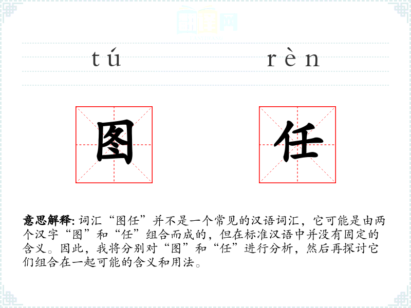 词汇“图任”并不是一个常见的汉语词汇,它可能是由两个汉字“图”和“任”组合而成的,但在标准汉语中并没有固定的含义。因此,我将分别对“图”和“任”进行分析,然后再探讨它们组合在一起可能的含义和用法。
