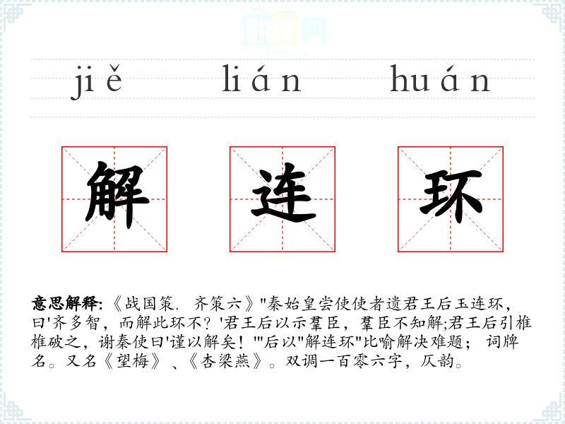 1.《战国策.齐策六》"秦始皇尝使使者遗君王后玉连环,曰'齐多智,而解此环不?'君王后以示羣臣,羣臣不知解;君王后引椎椎破之,谢秦使曰'谨以解矣!'"后以"解连环"比喻解决难题; 词牌名。又名《望梅》﹑《杏梁燕》。双调一百零六字,仄韵。