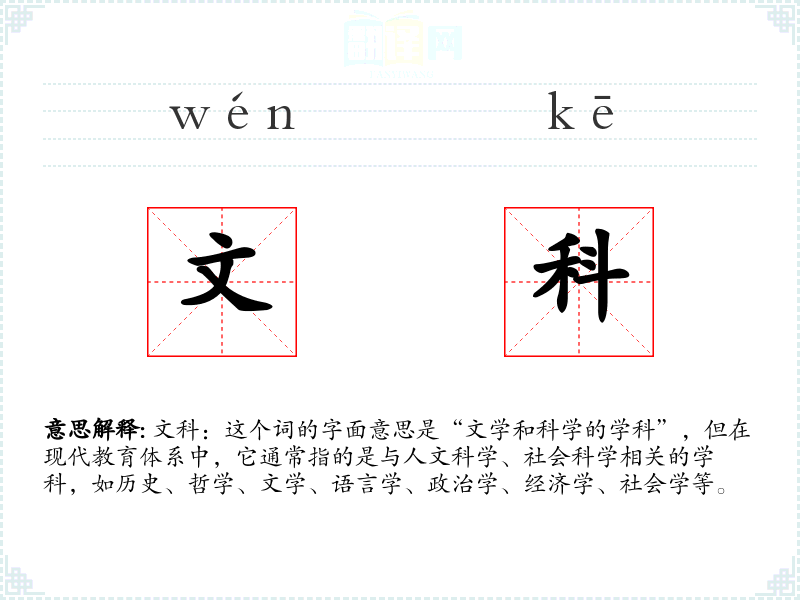 文科:这个词的字面意思是“文学和科学的学科”,但在现代教育体系中,它通常指的是与人文科学、社会科学相关的学科,如历史、哲学、文学、语言学、政治学、经济学、社会学等。
