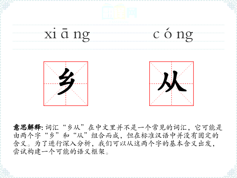 词汇“乡从”在中文里并不是一个常见的词汇,它可能是由两个字“乡”和“从”组合而成,但在标准汉语中并没有固定的含义。为了进行深入分析,我们可以从这两个字的基本含义出发,尝试构建一个可能的语义框架。