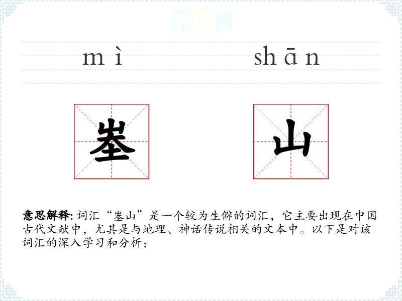 词汇“峚山”是一个较为生僻的词汇,它主要出现在*古代文献中,尤其是与地理、神话传说相关的文本中。以下是对该词汇的深入学和分析: