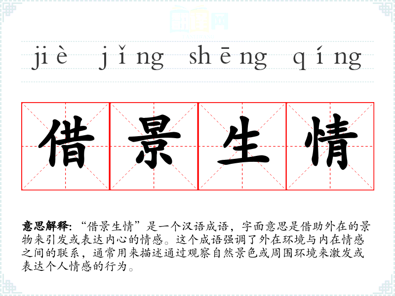 “借景生情”是一个汉语成语,字面意思是借助外在的景物来引发或表达内心的情感。这个成语强调了外在环境与内在情感之间的联系,通常用来描述通过观察自然景色或周围环境来激发或表达个人情感的行为。