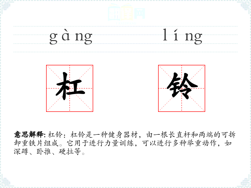 - 反义词:无(杠铃作为一种特定器材,没有直接的反义词)