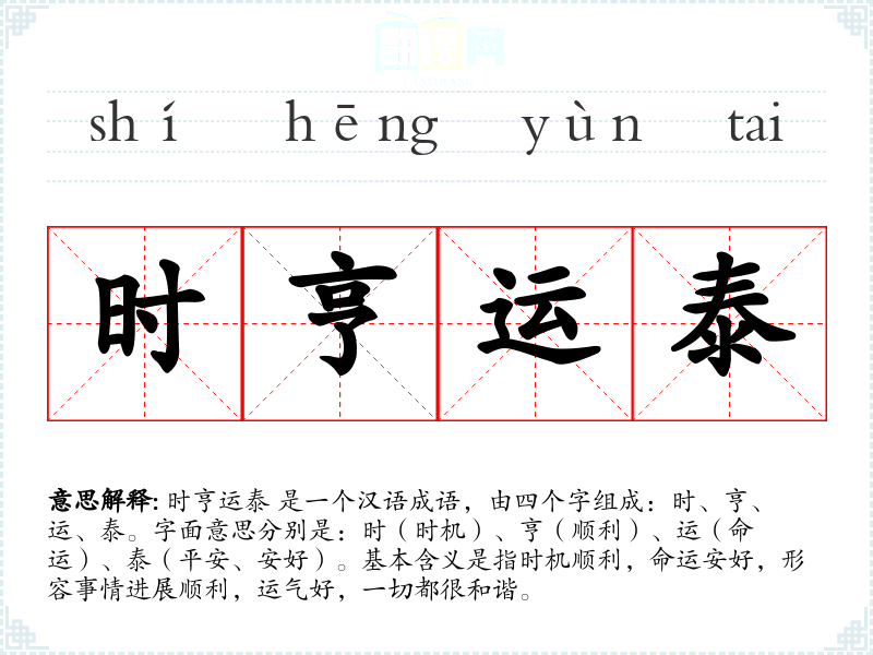 时亨运泰 是一个汉语成语,由四个字组成:时、亨、运、泰。字面意思分别是:时(时机)、亨(顺利)、运(命运)、泰(平安、安好)。基本含义是指时机顺利,命运安好,形容事情进展顺利,运气好,一切都很和谐。