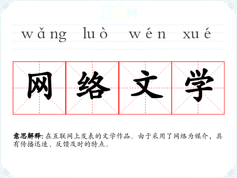 在互联网上发表的文学作品。由于采用了网络为媒介,具有传播迅速、反馈及时的特点。