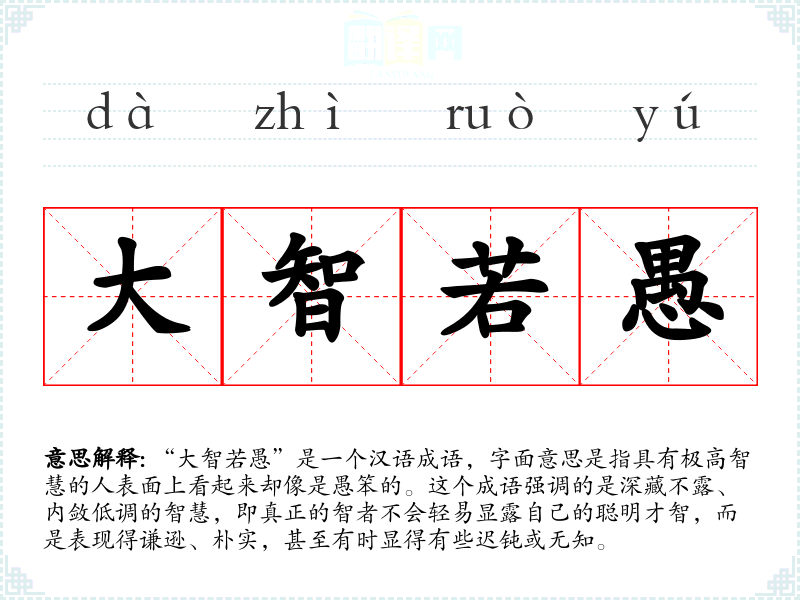 “大智若愚”是一个汉语成语,字面意思是指具有极高智慧的人表面上看起来却像是愚笨的。这个成语强调的是深藏不露、内敛低调的智慧,即真正的智者不会轻易显露自己的聪明才智,而是表现得谦逊、朴实,甚至有时显得有些迟钝或无知。