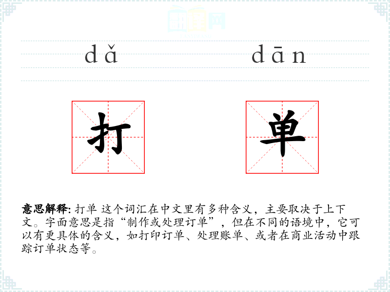 - 口语:在日常对话中,“打单”可能简单指打印或处理订单,如“我需要打单来确认今天的销售。”