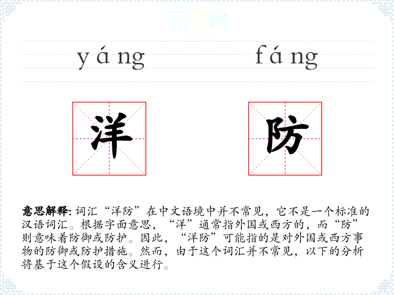 “洋防”可能指的是针对外国影响或西方文化的防御措施或政策。这可能包括政治、经济、文化或军事层面的防御。