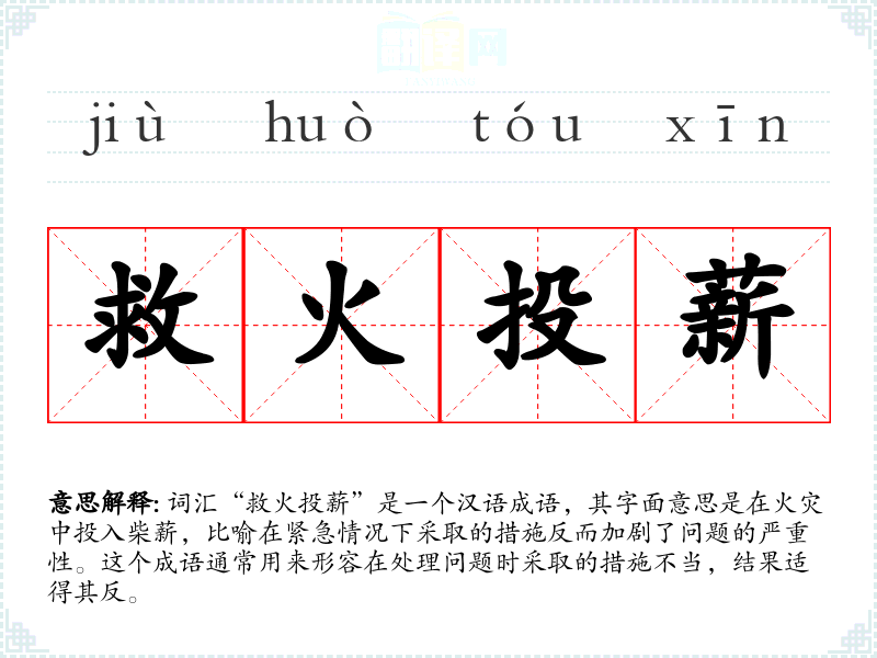 词汇“救火投薪”是一个汉语成语,其字面意思是在火灾中投入柴薪,比喻在紧急情况下采取的措施反而加剧了问题的严重性。这个成语通常用来形容在处理问题时采取的措施不当,结果适得其反。