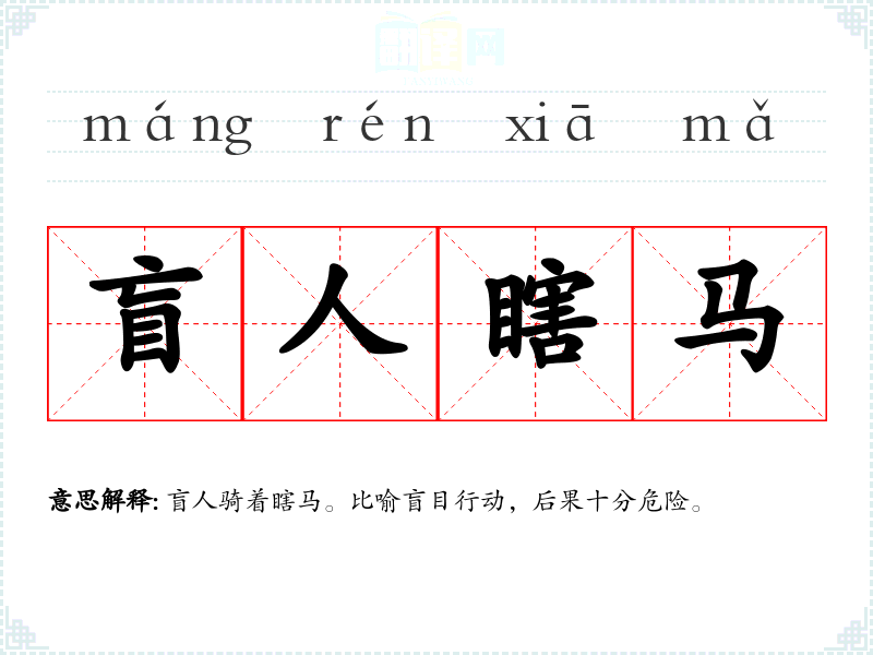 盲人骑着瞎马。比喻盲目行动,后果十分危险。