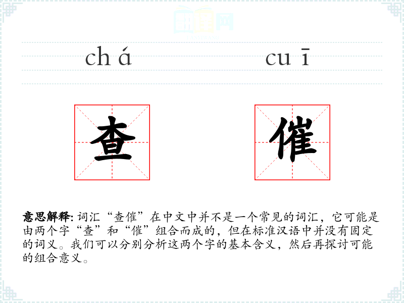 尽管“查催”不是一个标准词汇,通过对“查”和“催”的理解,我们可以推测它在特定语境下的意义。在语言学习和表达中,理解词汇的组合和可能的语境使用是非常重要的。