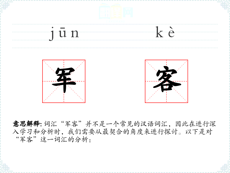 “军客”这一词汇在汉语中并不常见,其使用和含义可能需要根据具体语境来解释。在学习语言和表达时,了解和掌握常用词汇更为重要,而这类特殊词汇的学习可能更多地依赖于特定的语境和需求。