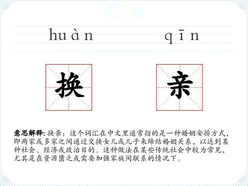 “换亲”这个词汇的词源较为直接,由“换”和“亲”两个字组成,分别表示交换和亲属关系。在历史上,这种婚姻形式可能源于对资源和权力的平衡需求,随着社会的发展,这种做法逐渐减少,但在某些地区或特定社会群体中仍有所保留。