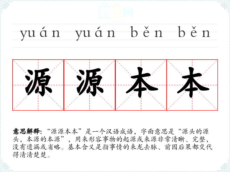“源源本本”是一个汉语成语,字面意思是“源头的源头,本源的本源”,用来形容事物的起源或来源非常清晰、完整,没有遗漏或省略。基本含义是指事情的来龙去脉、前因后果都交代得清清楚楚。