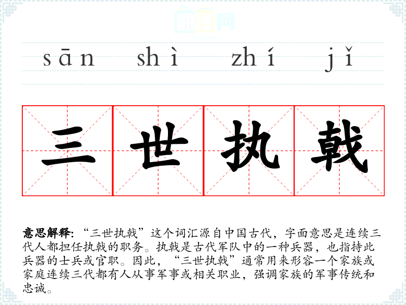 “三世执戟”这个词汇源自**古代,字面意思是连续三代人都担任执戟的职务。执戟是古代军队中的一种兵器,也指持此兵器的士兵或官职。因此,“三世执戟”通常用来形容一个家族或家庭连续三代都有人从事军事或相关职业,强调家族的军事传统和忠诚。