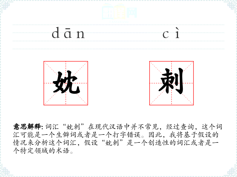 词汇“妉刺”在现代汉语中并不常见,经过查询,这个词汇可能是一个生僻词或者是一个打字错误。因此,我将基于假设的情况来分析这个词汇,假设“妉刺”是一个创造性的词汇或者是一个特定领域的术语。