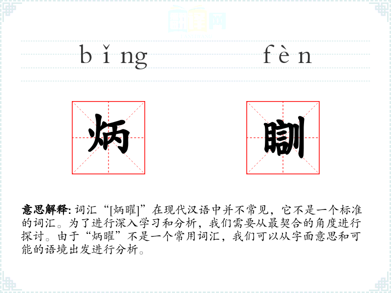 词汇“[炳曜]”在现代汉语中并不常见,它不是一个标准的词汇。为了进行深入学习和分析,我们需要从最契合的角度进行探讨。由于“炳曜”不是一个常用词汇,我们可以从字面意思和可能的语境出发进行分析。