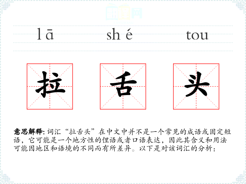 词汇“拉舌头”在中文中并不是一个常见的成语或固定短语,它可能是一个地方性的俚语或者口语表达,因此其含义和用法可能因地区和语境的不同而有所差异。以下是对该词汇的分析: