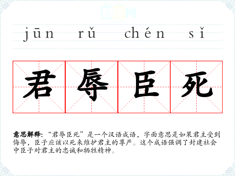 “君辱臣死”是一个汉语成语,字面意思是如果君主受到侮辱,臣子应该以死来维护君主的尊严。这个成语强调了封建社会中臣子对君主的忠诚和牺牲精神。