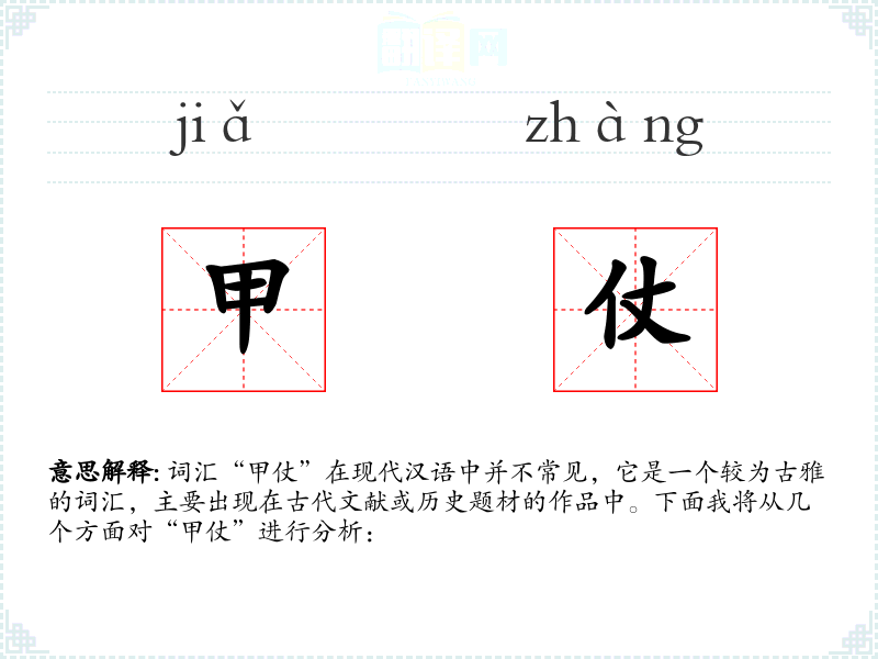词汇“甲仗”在现代汉语中并不常见,它是一个较为古雅的词汇,主要出现在古代文献或历史题材的作品中。下面我将从几个方面对“甲仗”进行分析: