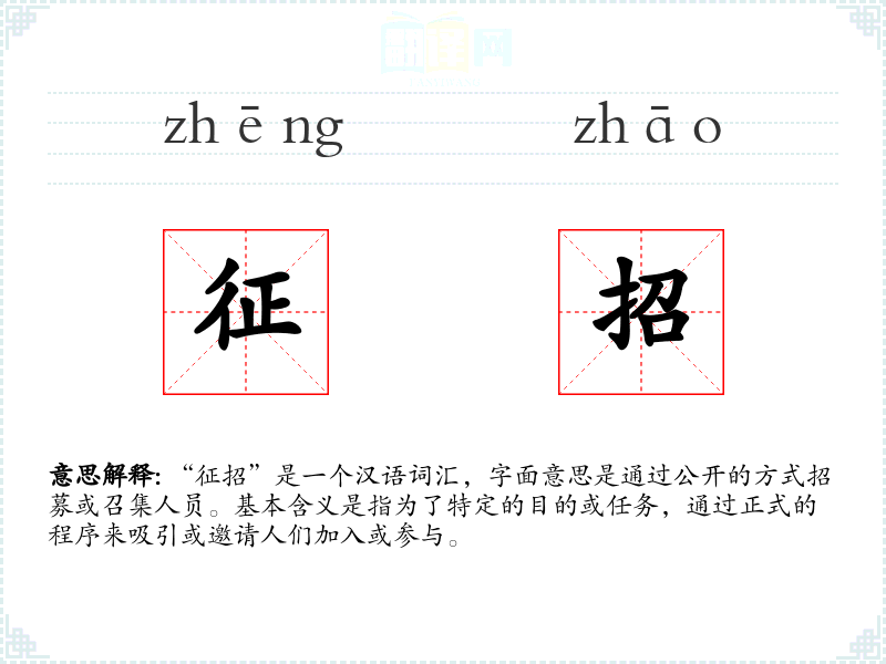 “征招”是一个汉语词汇,字面意思是通过公开的方式招募或召集人员。基本含义是指为了特定的目的或任务,通过正式的程序来吸引或邀请人们加入或参与。