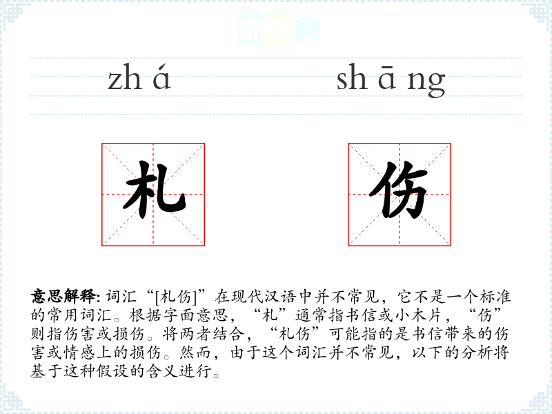 词汇“[札伤]”在现代汉语中并不常见,它不是一个标准的常用词汇。根据字面意思,“札”通常指书信或小木片,“伤”则指伤害或损伤。将两者结合,“札伤”可能指的是书信带来的伤害或情感上的损伤。然而,由于这个词汇并不常见,以下的分析将基于这种假设的含义进行。