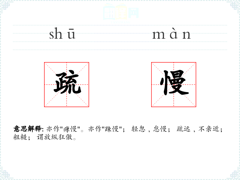 亦作"痚慢"。亦作"踈慢"; 轻忽﹐怠慢; 疏远﹐不亲近; 粗糙; 谓放纵狂傲。