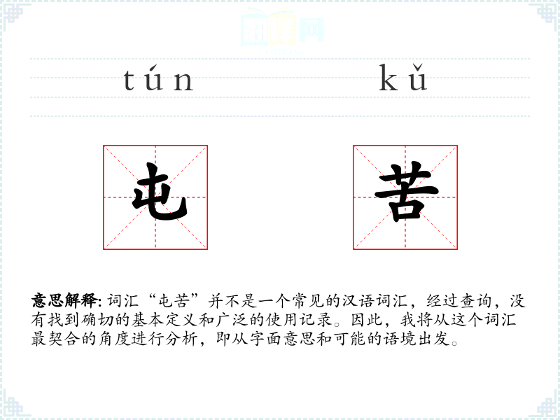 词汇“屯苦”并不是一个常见的汉语词汇,经过查询,没有找到确切的基本定义和广泛的使用记录。因此,我将从这个词汇最契合的角度进行分析,即从字面意思和可能的语境出发。