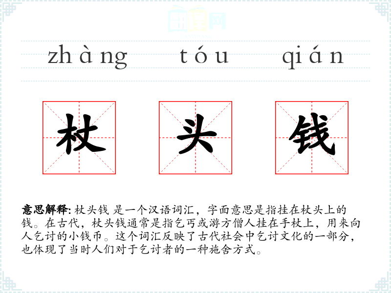通过对“杖头钱”这个词汇的学和分析,我们可以更深入地理解古代社会的经济状况和社会结构,以及乞讨文化在历史中的地位。这个词汇虽然可能在现代不再常用,但它仍然是语言学和文化研究中的一个有趣且有价值的元素。