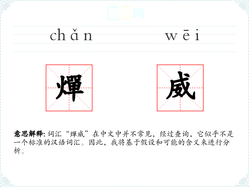 词汇“燀威”在中文中并不常见,经过查询,它似乎不是一个标准的汉语词汇。因此,我将基于假设和可能的含义来进行分析。