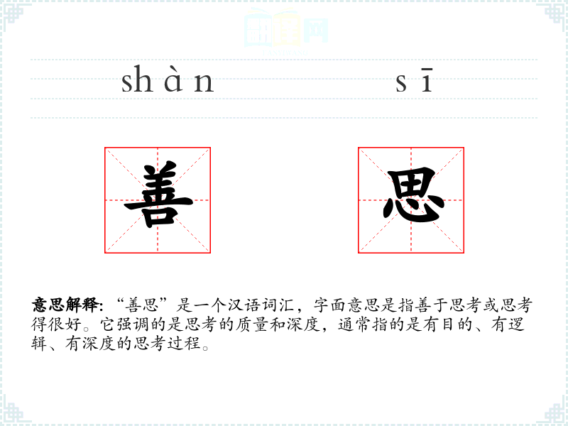 “善思”由“善”和“思”两个字组成。“善”在古代汉语中有多重含义,包括好、擅长等;“思”则指思考、思念。这两个字组合起来,强调了思考的良好品质。在古代文献中,“善思”可能更多地用于描述人的性格或行为特征。
