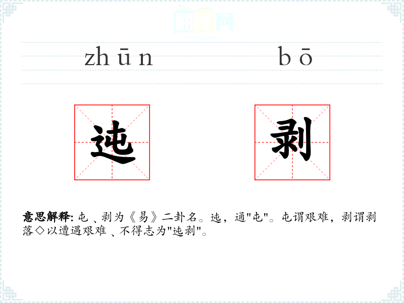 屯﹑剥为《易》二卦名。迍,通"屯"。屯谓艰难,剥谓剥落◇以遭遇艰难﹑不得志为"迍剥"。