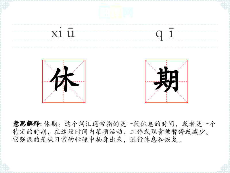 休期:这个词汇通常指的是一段休息的时间,或者是一个特定的时期,在这段时间内某项活动、工作或职责被暂停或减少。它强调的是从日常的忙碌中抽身出来,进行休息和恢复。