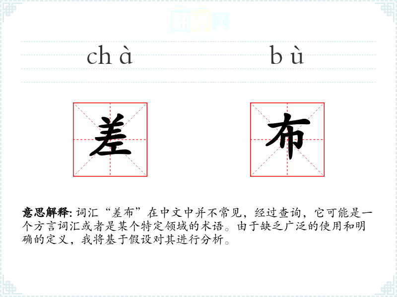 词汇“差布”在中文中并不常见,经过查询,它可能是一个方言词汇或者是某个特定领域的术语。由于缺乏广泛的使用和明确的定义,我将基于假设对其进行分析。