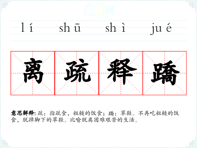 疏:指疏食,粗糙的饭食;蹻:草鞋。不再吃粗糙的饭食,脱掉脚下的草鞋。比喻脱离困难艰苦的生活。