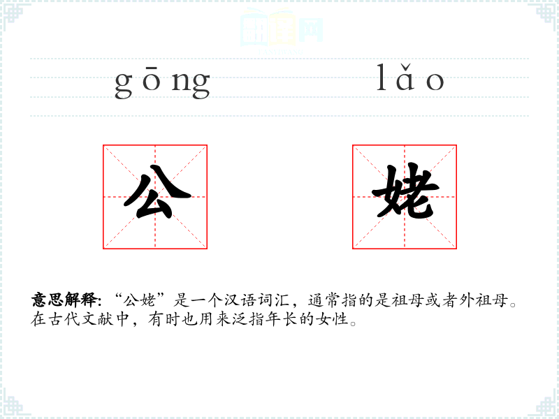 “公姥”是一个汉语词汇,通常指的是祖母或者外祖母。在古代文献中,有时也用来泛指年长的女性。