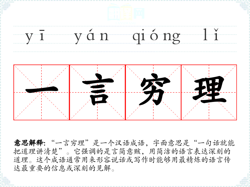 “一言穷理”这个成语的词源较为明确,源自古代的文学和哲学传统。在古代,许多哲学家和文学家都追求言简意赅的表达方式,这种追求在成语中得到了体现。随着时间的推移,这个成语被广泛应用于各种语境,成为汉语中的一个常用表达。
