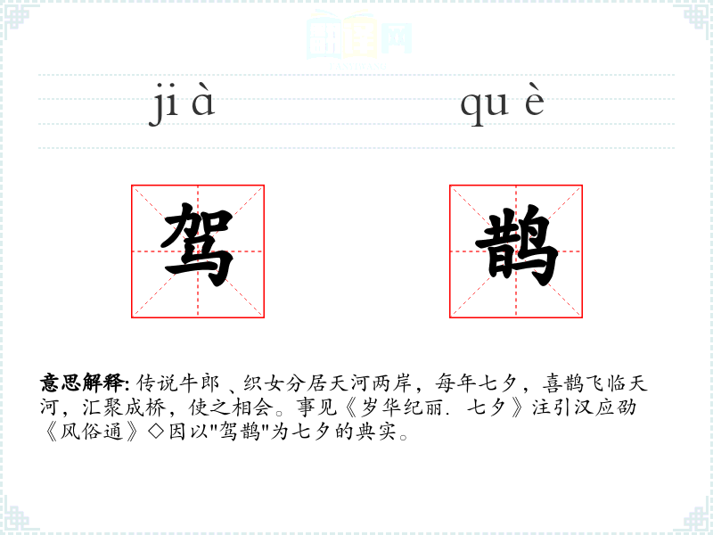 传说牛郎﹑织女分居天河两岸,每年七夕,喜鹊飞临天河,汇聚成桥,使之相会。事见《岁华纪丽.七夕》注引汉应劭《风俗通》◇因以"驾鹊"为七夕的典实。