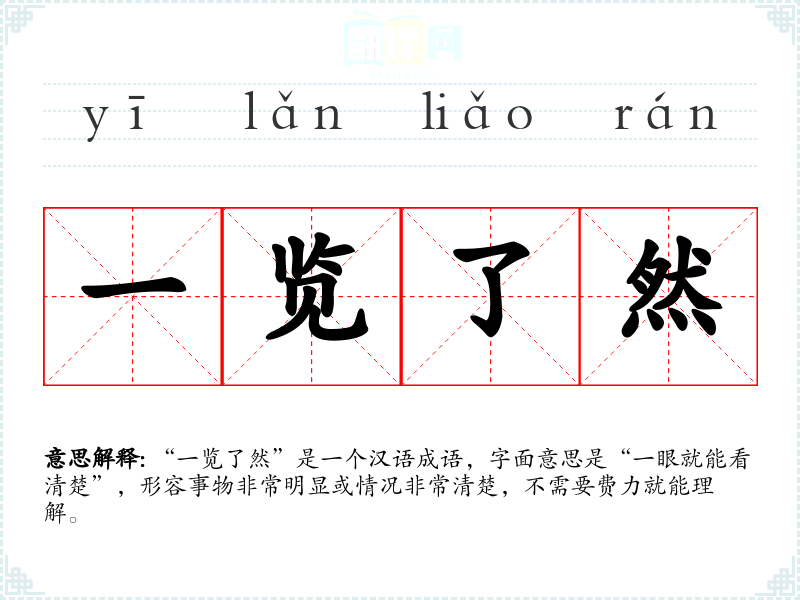 “一览了然”是一个汉语成语,字面意思是“一眼就能看清楚”,形容事物非常明显或情况非常清楚,不需要费力就能理解。