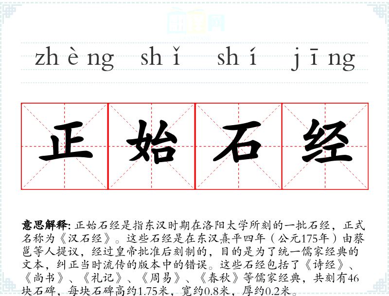 - 同义词:汉石经、熹平石经(因为正始石经是在熹平年间刻制的)