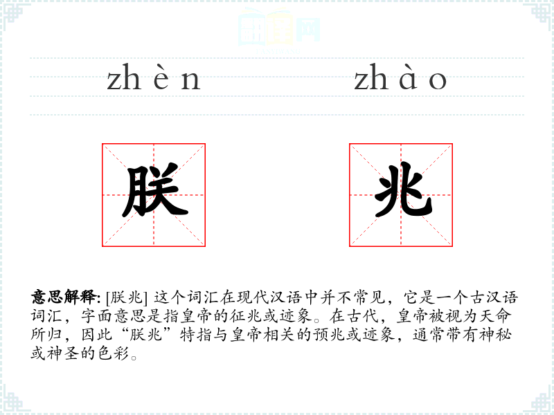 [朕兆] 这个词汇在现代汉语中并不常见,它是一个古汉语词汇,字面意思是指的征兆或迹象。在古代,被视为天命所归,因此“朕兆”特指与**相关的预兆或迹象,通常带有神秘或神圣的色彩。