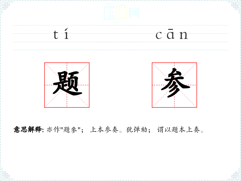 亦作"题參"; 上本参奏。犹弹劾; 谓以题本上奏。
