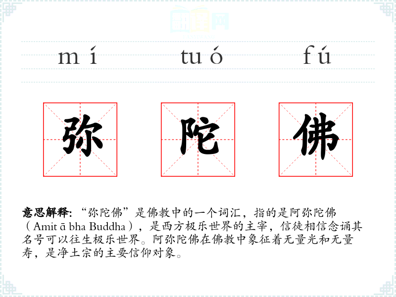 “弥陀佛”是中的一个词汇,指的是阿弥陀佛(Amitābha Buddha),是西方极乐世界的主宰,信徒相信念诵其名号可以往生极乐世界。阿弥陀佛在中象征着无量光和无量寿,是净土宗的主要信仰对象。