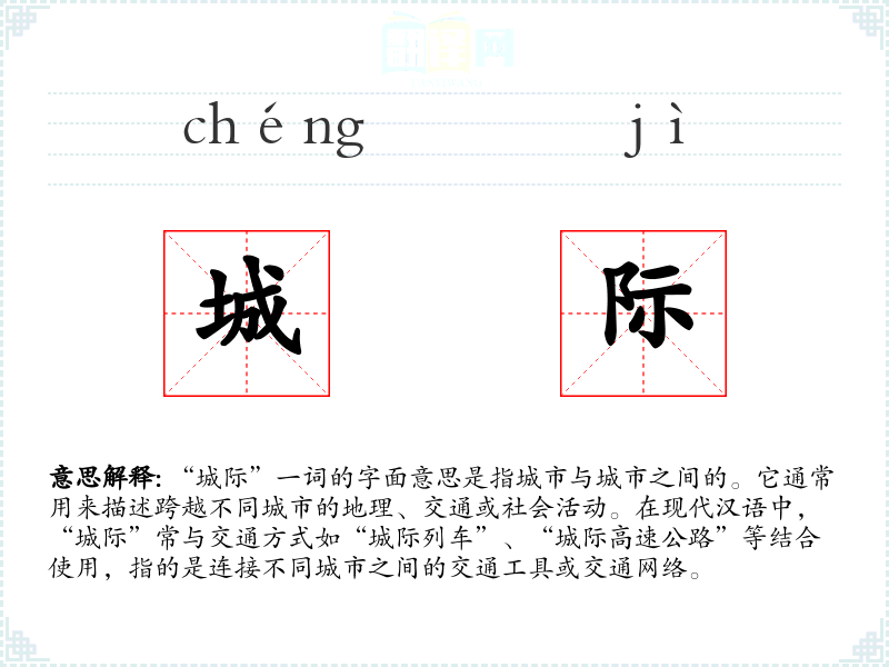 “城际”一词的字面意思是指城市与城市之间的。它通常用来描述跨越不同城市的地理、交通或社会活动。在现代汉语中,“城际”常与交通方式如“城际列车”、“城际高速公路”等结合使用,指的是连接不同城市之间的交通工具或交通网络。