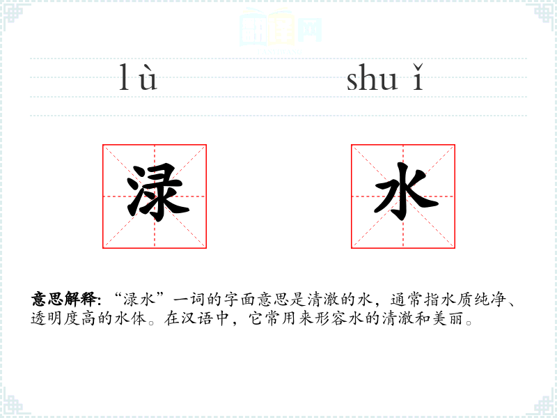 “渌水”一词的字面意思是清澈的水,通常指水质纯净、透明度高的水体。在汉语中,它常用来形容水的清澈和美丽。
