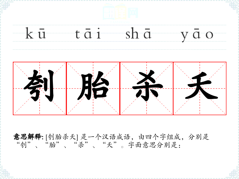 [刳胎杀夭] 是一个汉语成语,由四个字组成,分别是“刳”、“胎”、“杀”、“夭”。字面意思分别是: