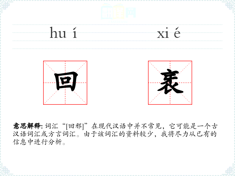 词汇“[回邪]”在现代汉语中并不常见,它可能是一个古汉语词汇或方言词汇。由于该词汇的资料较少,我将尽力从已有的信息中进行分析。