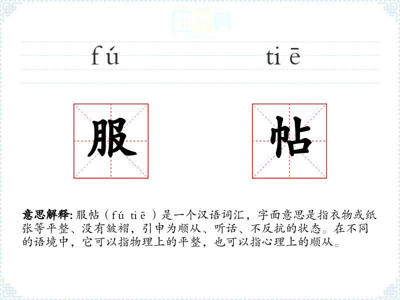 服帖(fú tiē)是一个汉语词汇,字面意思是指衣物或纸张等平整、没有皱褶,引申为顺从、听话、不反抗的状态。在不同的语境中,它可以指物理上的平整,也可以指心理上的顺从。