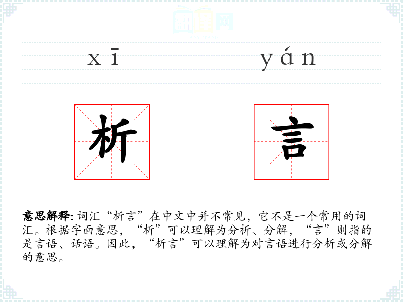 由于“析言”不是一个常用词汇,它在不同语境下的使用可能较为有限。在学术或专业领域,特别是在语言学、文学批评中,可能会使用到这个词来指代对文本的深入分析。