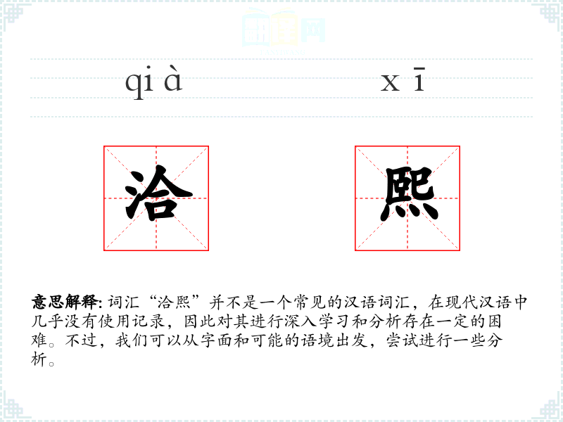 词汇“洽熙”并不是一个常见的汉语词汇,在现代汉语中几乎没有使用记录,因此对其进行深入学习和分析存在一定的困难。不过,我们可以从字面和可能的语境出发,尝试进行一些分析。